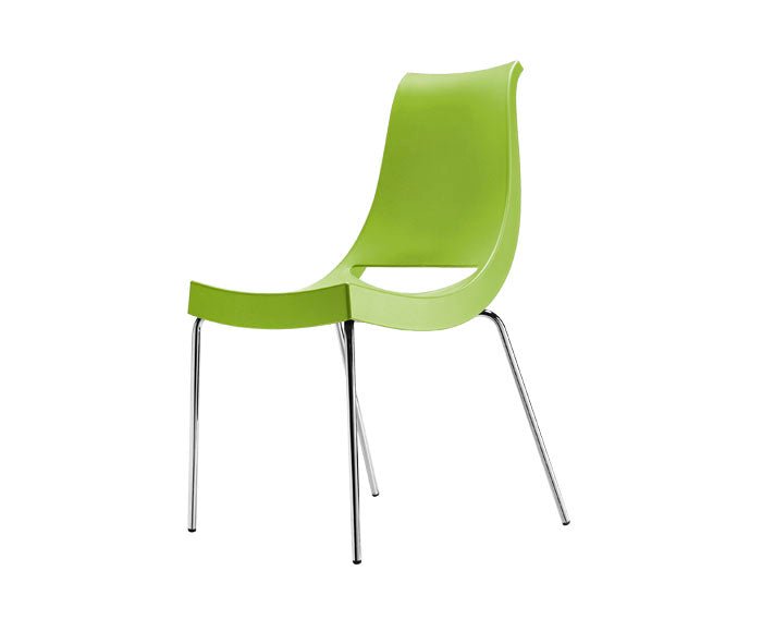 Materials: Stackable 4 legged side chair. Tubular steel base in indoor lacquer, outdoor lacquer, polished chrome or stainless steel finish. Seat in polypropylene or glossy polycarbonate. Stacks 10 chairs high.